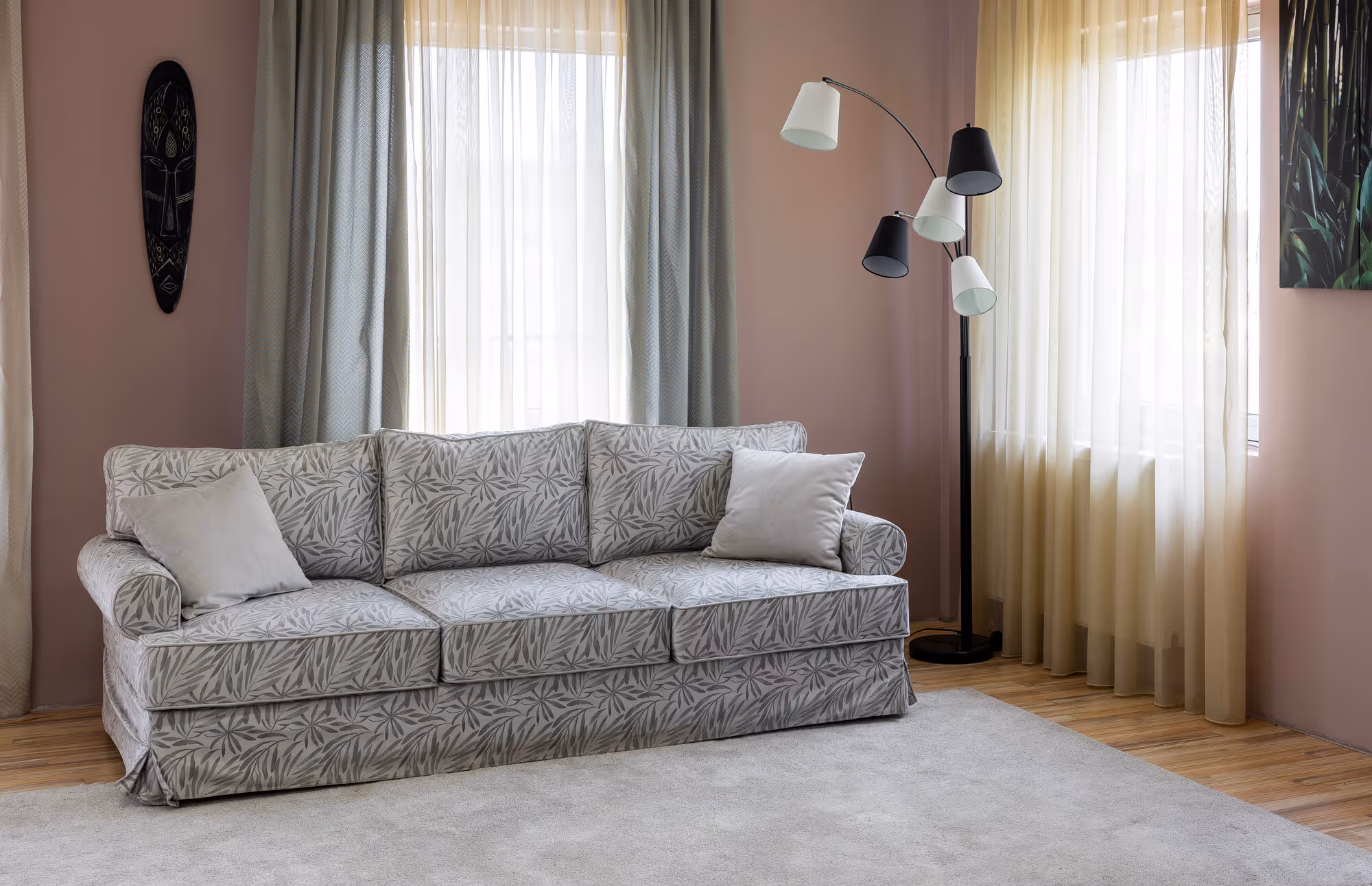 Ukrasni keder na sofi je u jednobojnom svetlom plišu.